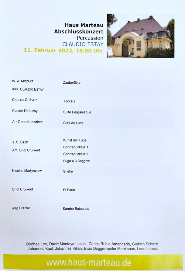 (Arrangement by Oriol Cruixent) / Claudio Estay's class, Haus Marteau Percussion Masterclass / Lichtenberg (Germany) / 18:00 (more info)